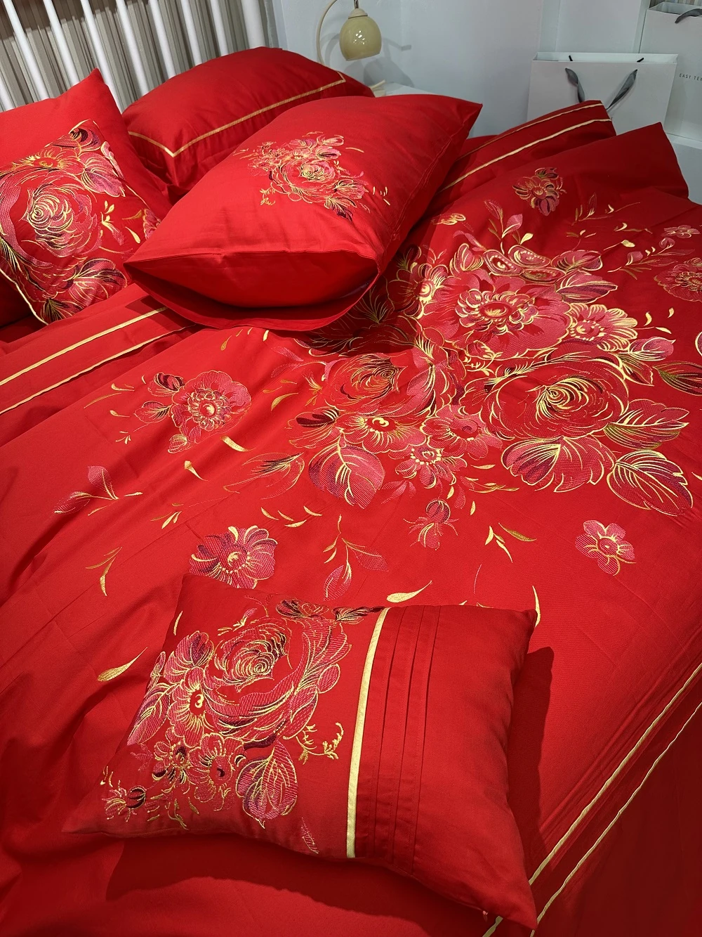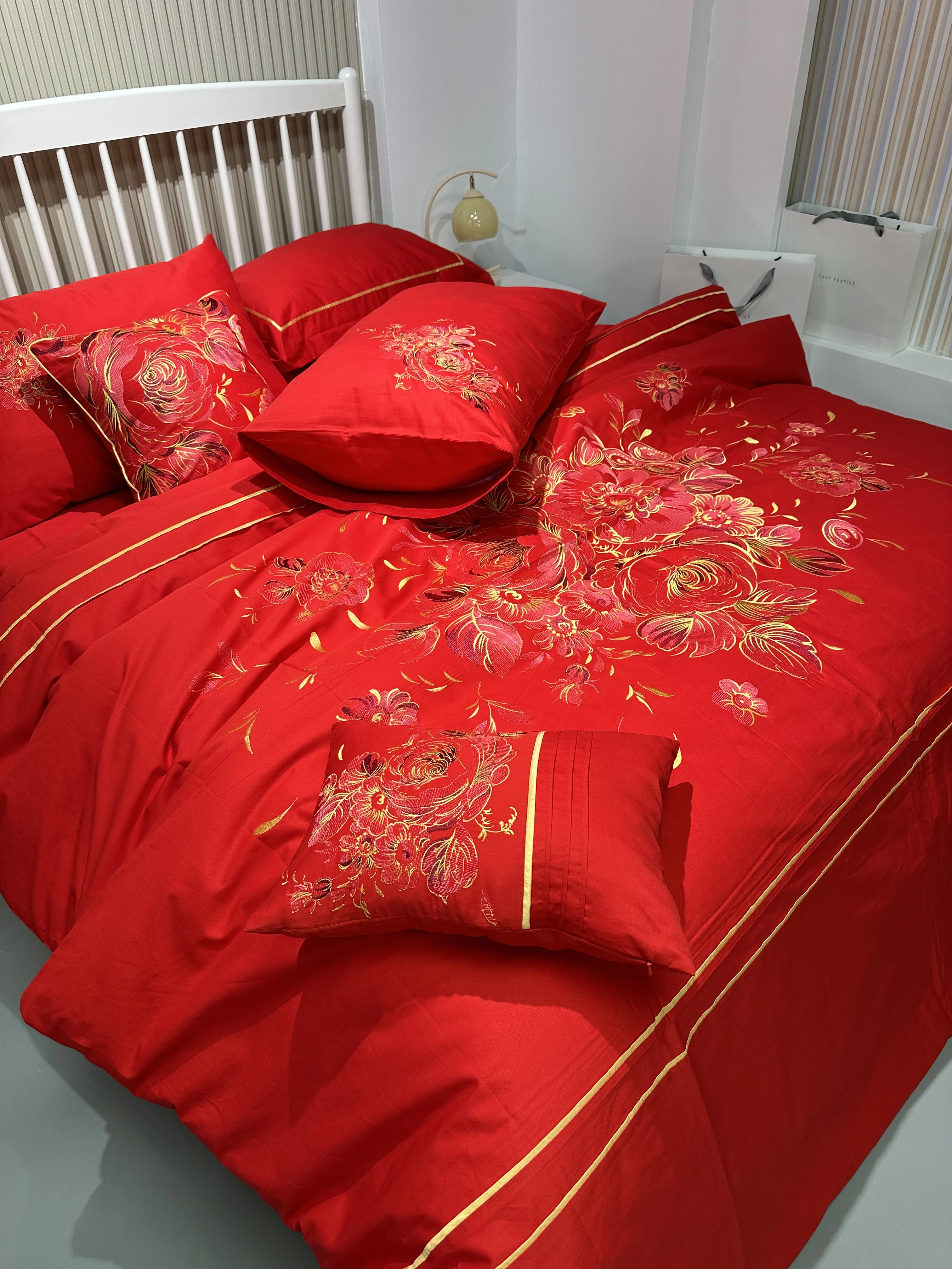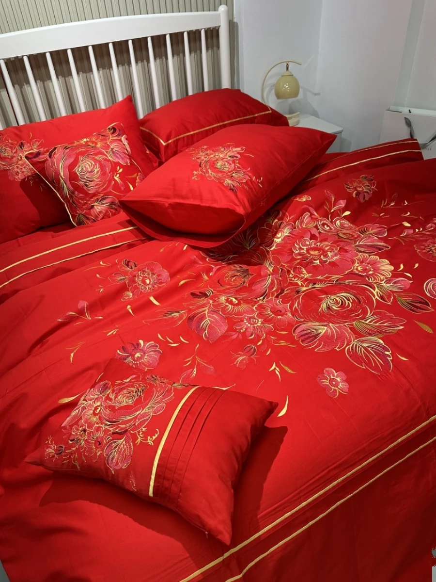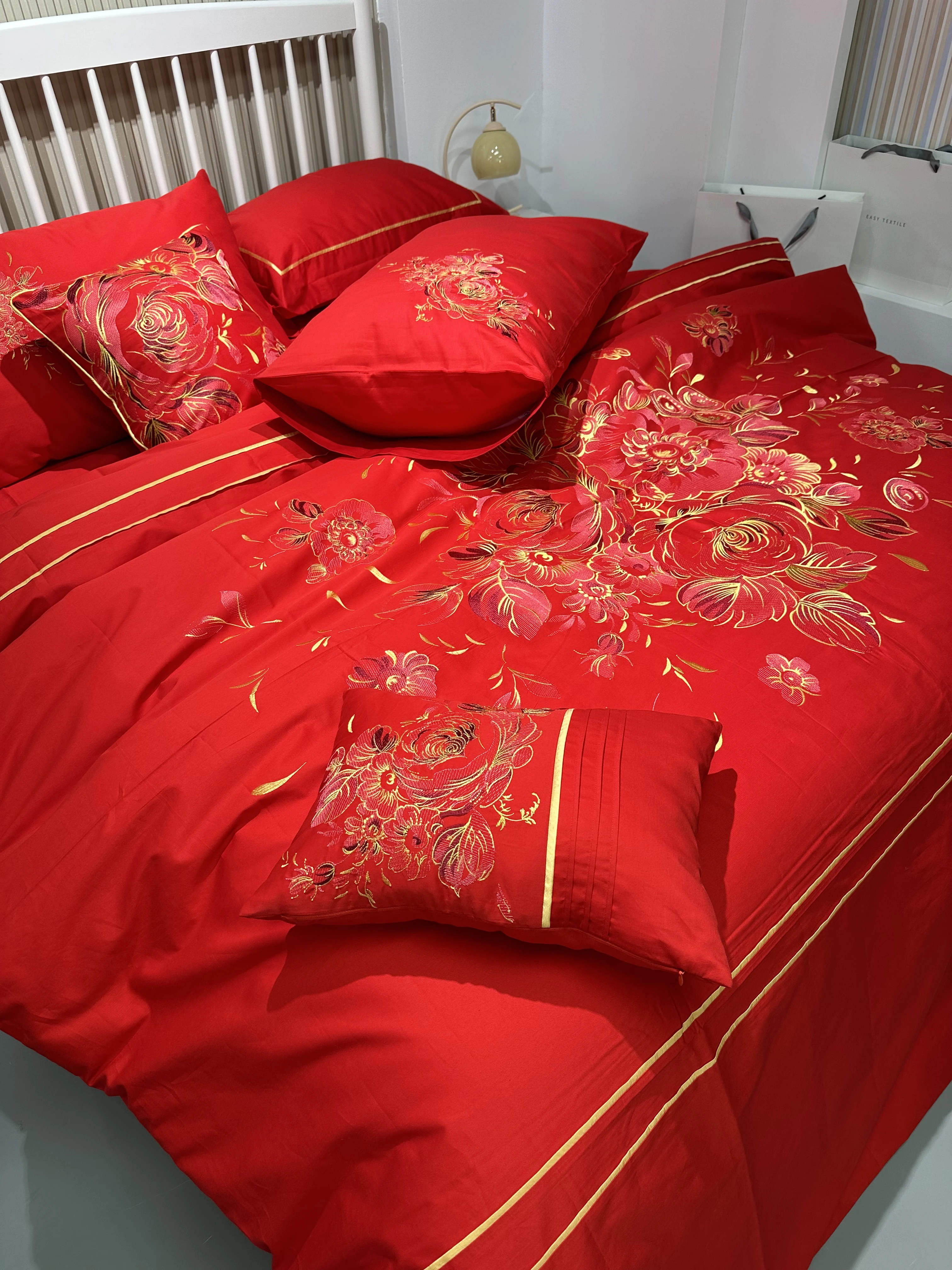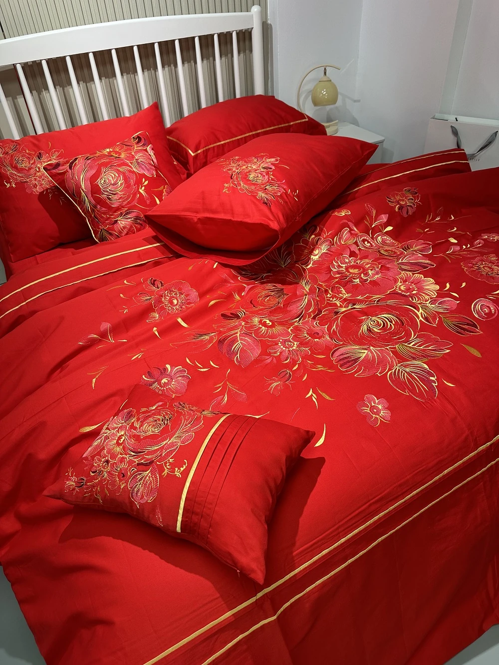 EASY Bedding Luxury Red Embroidered Floral Cotton Wedding Bedding Set (4-8 Pieces) – Original Design for a Glamorous Celebration
