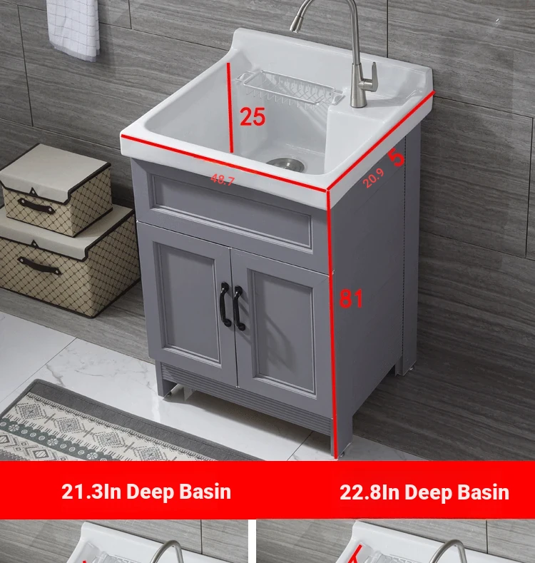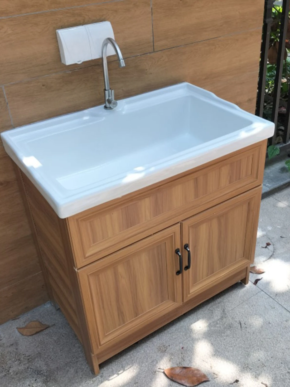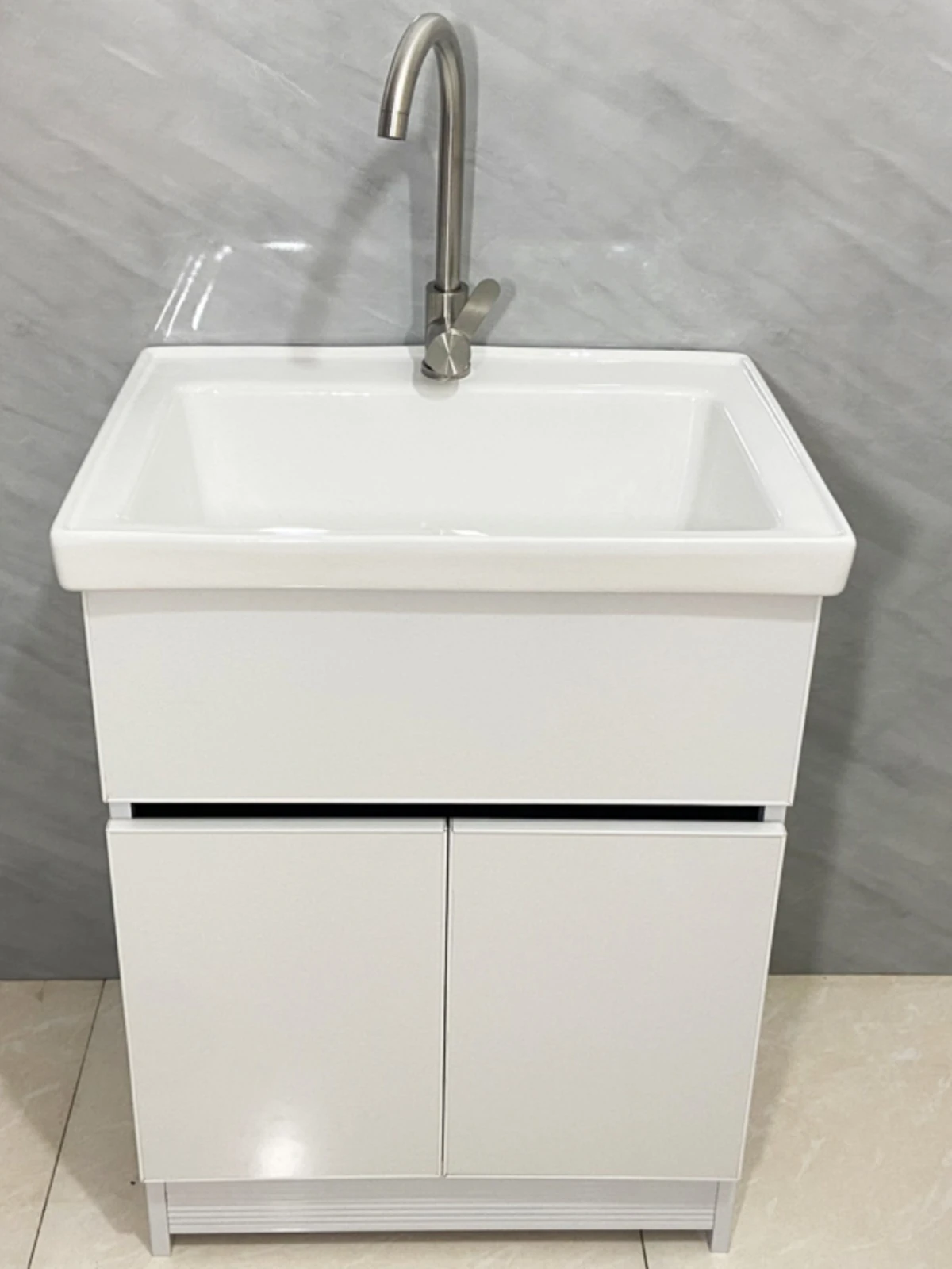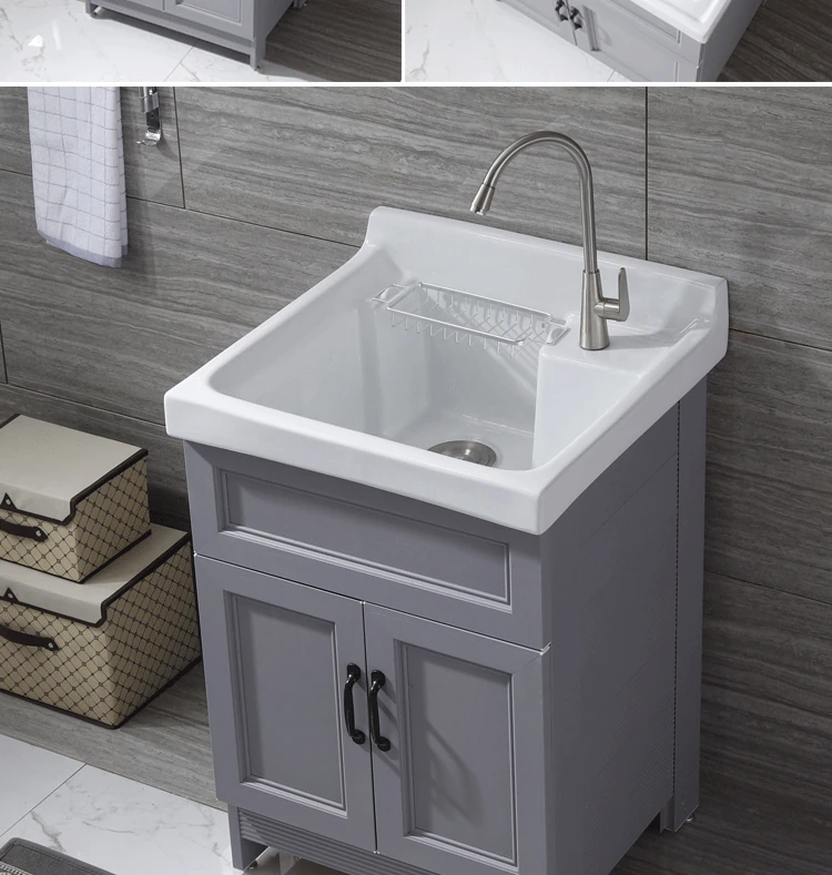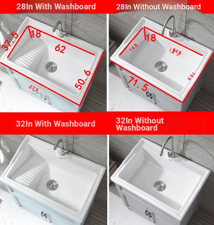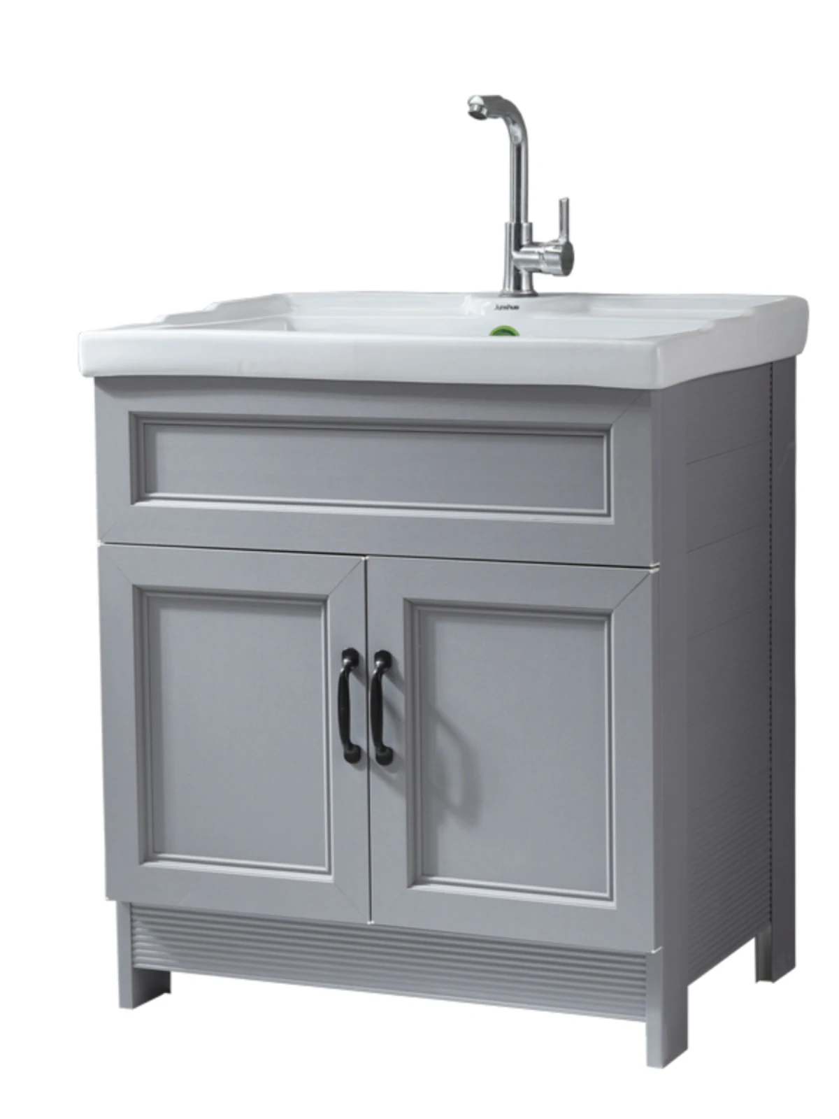 Space Aluminum Laundry Cabinet with Ceramic Sink and Scrub Board - Outdoor Free-Standing Balcony Laundry Sink and Integrated Basin for Wash and Handwashing.